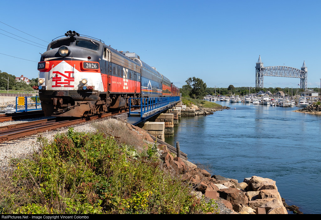 MC 2026 shoves dinner train equipment over Cohasset Narrows after meeting the Energy Train. The vertical-lift railroad bridge is seen in the background.
