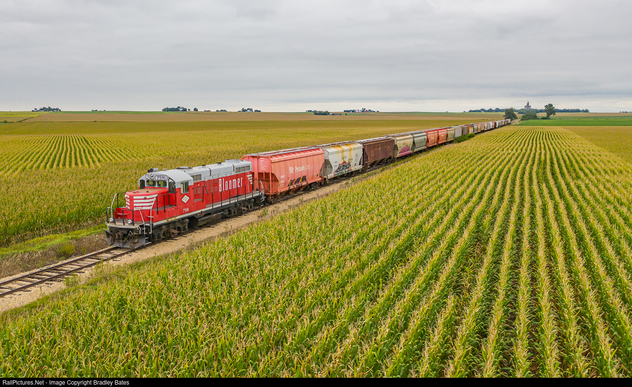 Bloomer Line Railroad (BLOL) GP10 #7591 is on the rear of an empty hopper Train heading west through the corn fields passed MP 224 just east of Anchor, Illinois returning from Colfax on an overcast afternoon.
