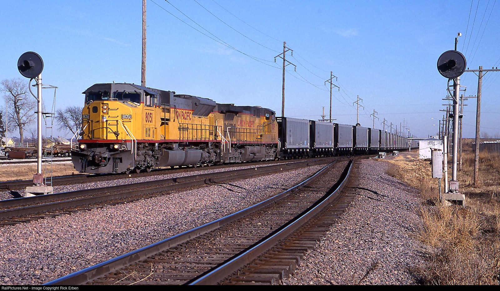 Most days one could just sit by the tracks and watch coal trains go past like a steady procession, loaded or empty. It's a crisp and clear December afternoon as the 8051 arrives in Fremont with a set of empties. The single track former C&NW line from Missouri Valley, IA that bypasses Omaha widens to three tracks entering Fremont to accommodate westbound traffic while crews are changed.