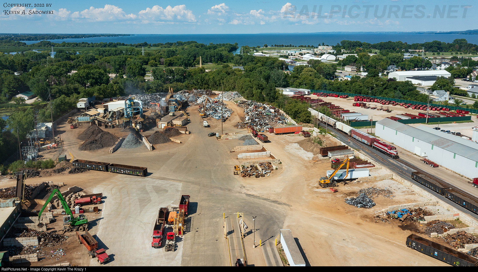 Watco's Fox Valley & Lake Superior Eden Spur local is seen passing Sadoff Iron & Metal on CN's Waukesha Sub between Shops Yard and the Eden Spur.