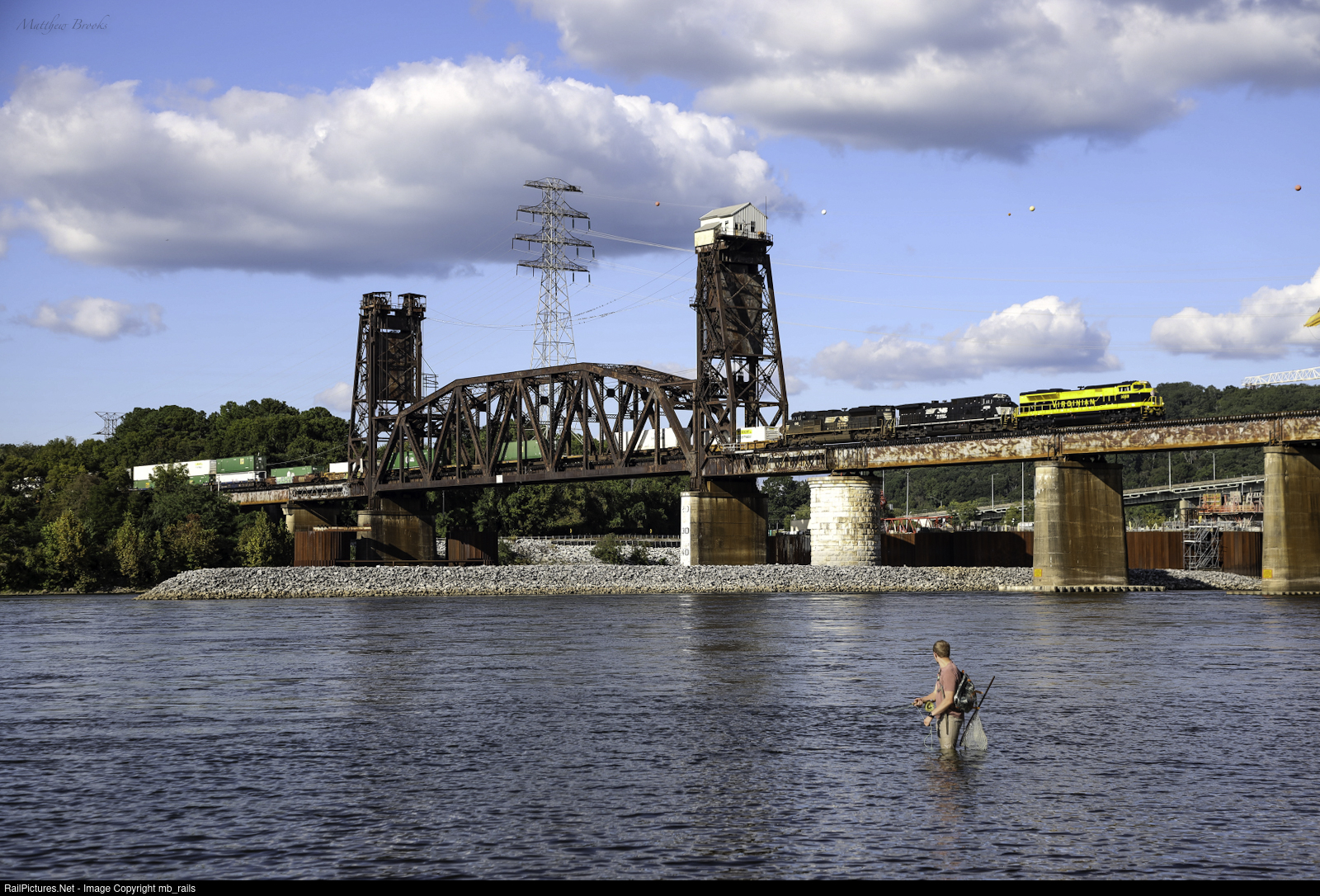 NS 29F rolls across Tenbridge with the Virginian heritage unit leading as they make their way into Chattanooga, Tennessee as the fishermen does his hobby.