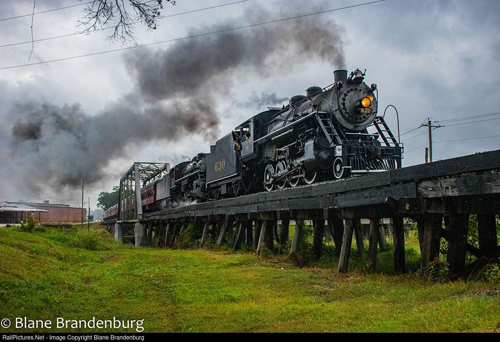 Here we see two former Southern Railway steam locomotives leading the train as they cross the Chattooga River in Trion Georgia. Leading the train was Southern 630 a consolidation 2-8-0 Ks-1 class built by Alco in 1904 and trailing was Southern 4501 a Mikado 2-8-2 Ms Class built by Baldwin Locomotive Works in 1911. Hearing these two steam engines work together was a nice treat and a welcomed sight by many. |