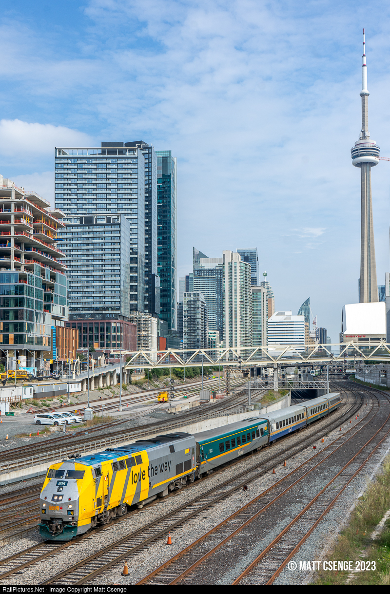 VIA Rail P42DC no. 905 (GE Genesis, 1992-2001) is seen approaching the Bathurst St Bridge after operating Corridor train 643 to Union Station. |
