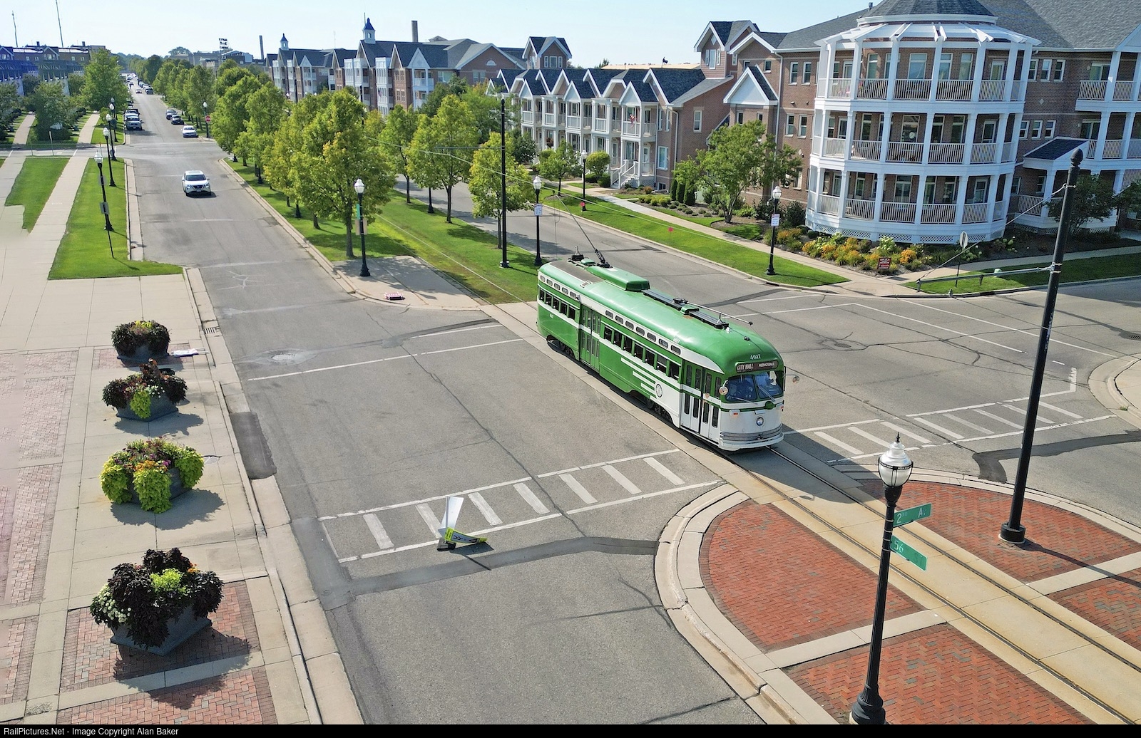 On the Kenosha Lake Front Trolley, a PCC car painted in the SF Muni scheme ambles east along 56th Street