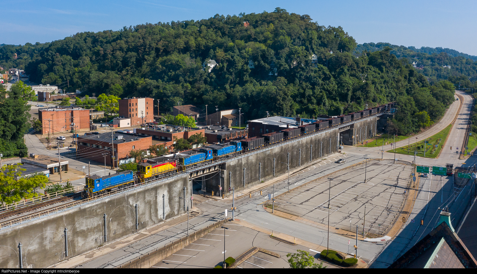 | A quartet of Union Railroad MP15's roll over the viaduct in East Pittsburgh, Pennsylvania as they bring a train of loaded ore cars south. These cars are picked up from the interchange with CN's Bessemer Subdivision in North Bessemer and will feed the furnace at the US Steel Edgar Thompson works in Braddock. |