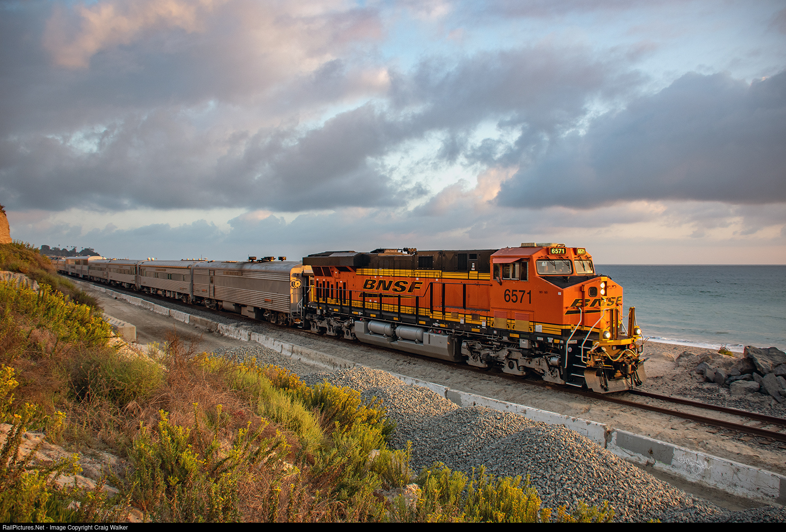 BNSF Railway officer special O-SDGLAC1-20A travels along the California coast at dusk as it heads from San Diego to Fullerton, where it will unload passengers, and then moves on to Commerce, near downtown Los Angeles. BNSF ES44C4 6571 is pulling a nine-car train of cars from the railway's business car fleet, following Amtrak Pacific Surfliner 587. As this is one of the best times to view the beach, every passenger onboard is seated on the left side, taking in the setting sun as it dips into the Pacific Ocean. (San Clemente, California – September 20, 2023)