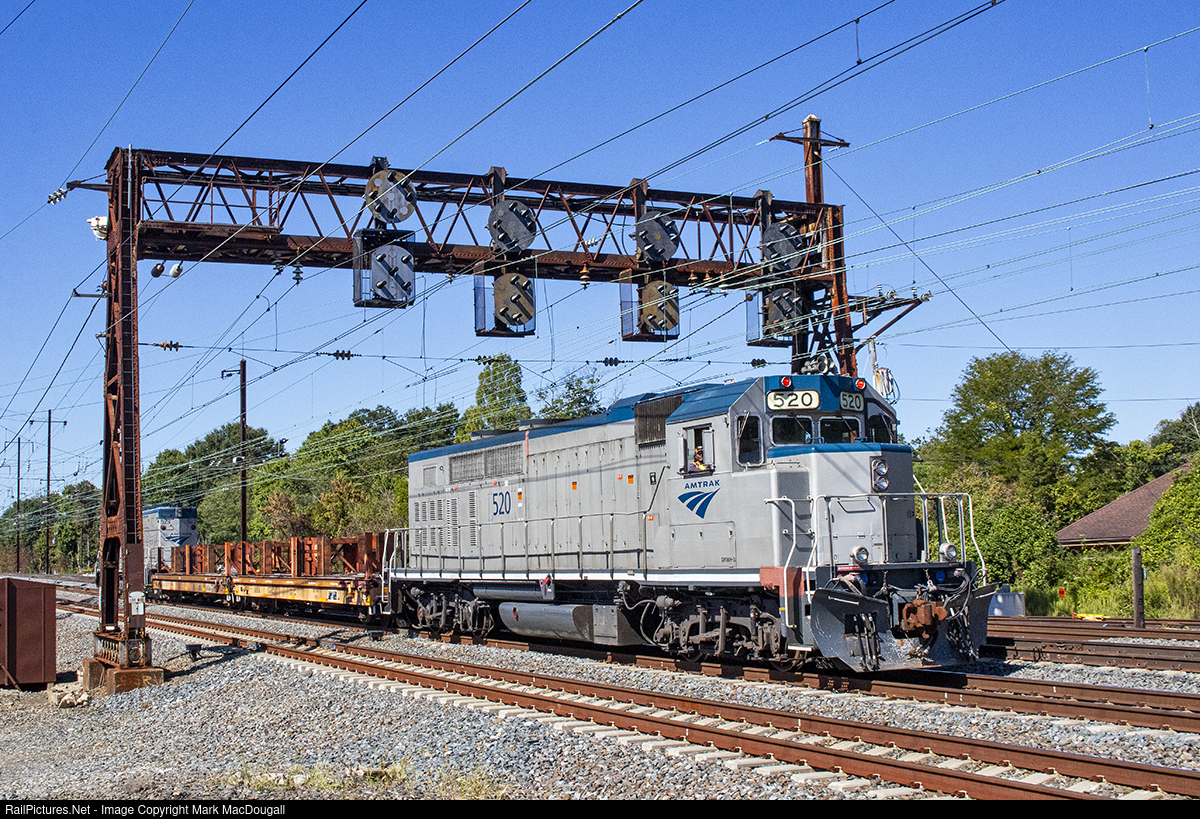 | Amtrak work train crew KP701 passes under the position light signals at DAVIS interlocking prior to entering the NS Delmarva Secondary. The train is shuttling tie flats between Wilmington and Bear with a pair of former GO Transit GP40TC rebuilds. |