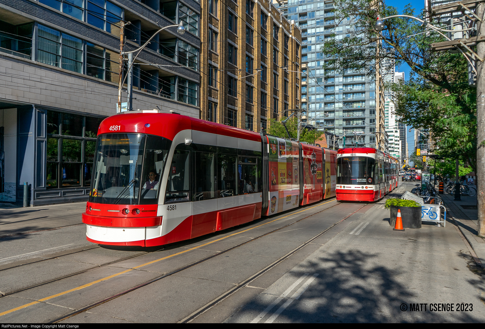 Toronto Transit Commission (TTC) Flexity Outlook no. 4546 & 4581 (Bombardier, 2009-present) are seen passing on King St while operating Route 504 service. TTC streetcars are unidirectional, and the subtle differences between the front and rear of the vehicles can be seen here. |