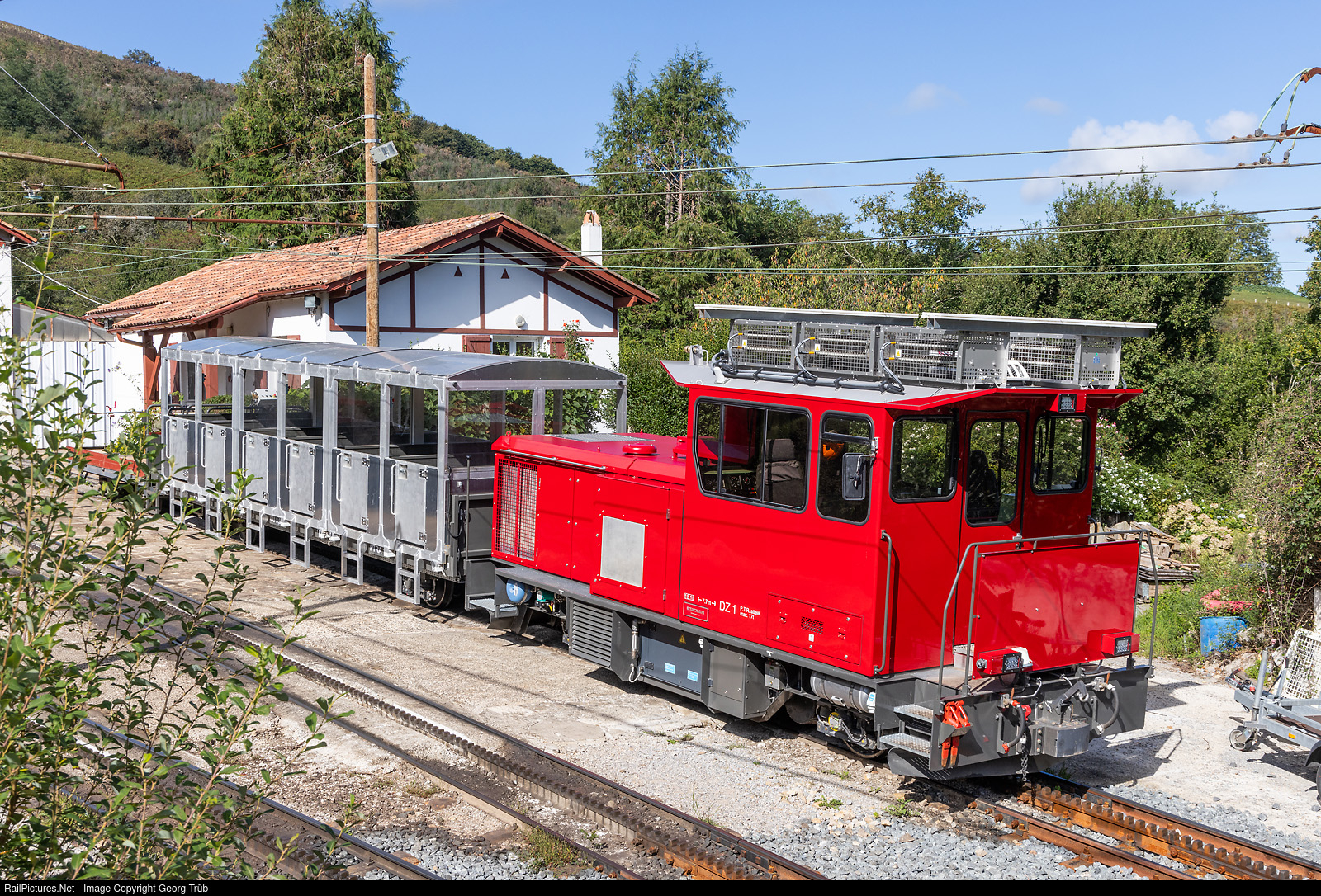| Cogwheel diesellocomotive HGm 2/2 "DZ # 1 of the La Rhune railway in the depot of the railway, above Col de Saint-Ignace. The locomotive was built by StadlerRail in 2021 for the track rebuilding works and now used for maintenance and evacuation trains. The new aluminium car behind serves for rescue or evacuation purposes. Nowadays, the railway is operated by the Établissement public des stations d’altitude (EPSA). |