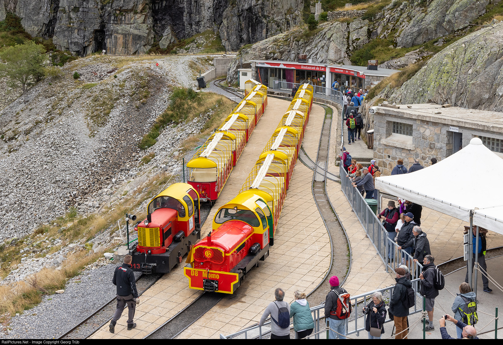 Lac d' Artouste station on about 1940 meter a.s.l. of the "Petit train d'Artouste", which is a narrow gauge (500mm, 19 3?4 in) tourist railway situated in the French Pyrenees. The line is 10 km (6.2 mi) long at an altitude of about 2000 m (6,561 ft). The line was originally built to facilitate the construction of the Artouste Lake Dam in 1920. Trains with diesellocomotives D # 13 and D # 8 "Momo". The line was built by the Compagnie des chemins de fer du Midi as transport line for the construction of the power station dam for the Lake d'Artouste. From 1932 used as tourist railway. From 1938 to 1981 owned and operated by the SNCF. Today, the train is owned by Société Hydro-Electrique du Midi (SHEM), manager of the Artouste dam. SHEM has entrusted the tourist management of the train to the local authority. Operated by Etablissement Public des Stations d‘Altitude (EPSA).