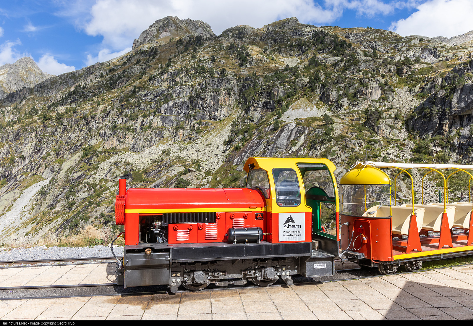 | Diesel locomotive D # 4 "Juju" of the 50 centimeter gauge tourist railway "Petit train d'Artouste" in the french Pyrenees, in the Lake d'Artouste station on about 1940 meter a.s.l. The locomotive was built by Billard about 1963. |