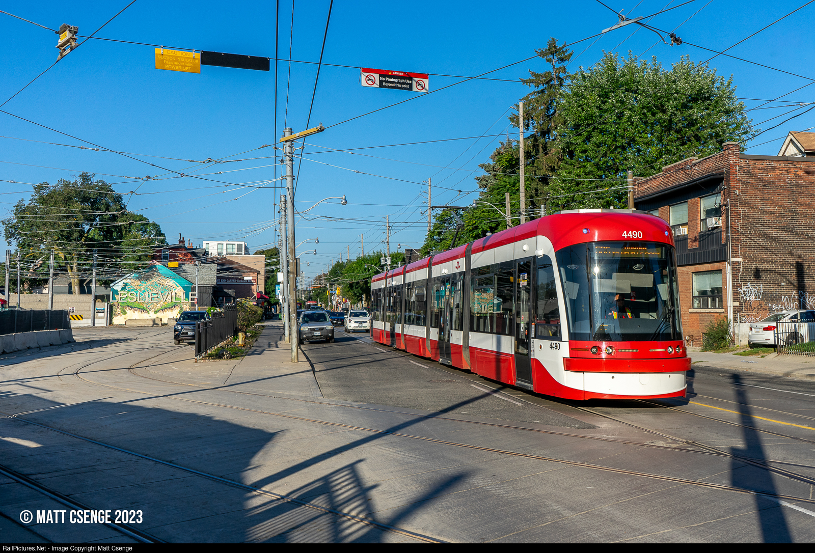 Toronto Transit Commission (TTC) Flexity Outlook no. 4490 (Bombardier, 2009-present) is passing the lead to Russell Yard as it operates a Route 505 service east along Queen St. TTC's streetcars feature both a trolley pole and a pantograph, the former of which must be used in the Russell Yard, per the sign visible above the wire. |