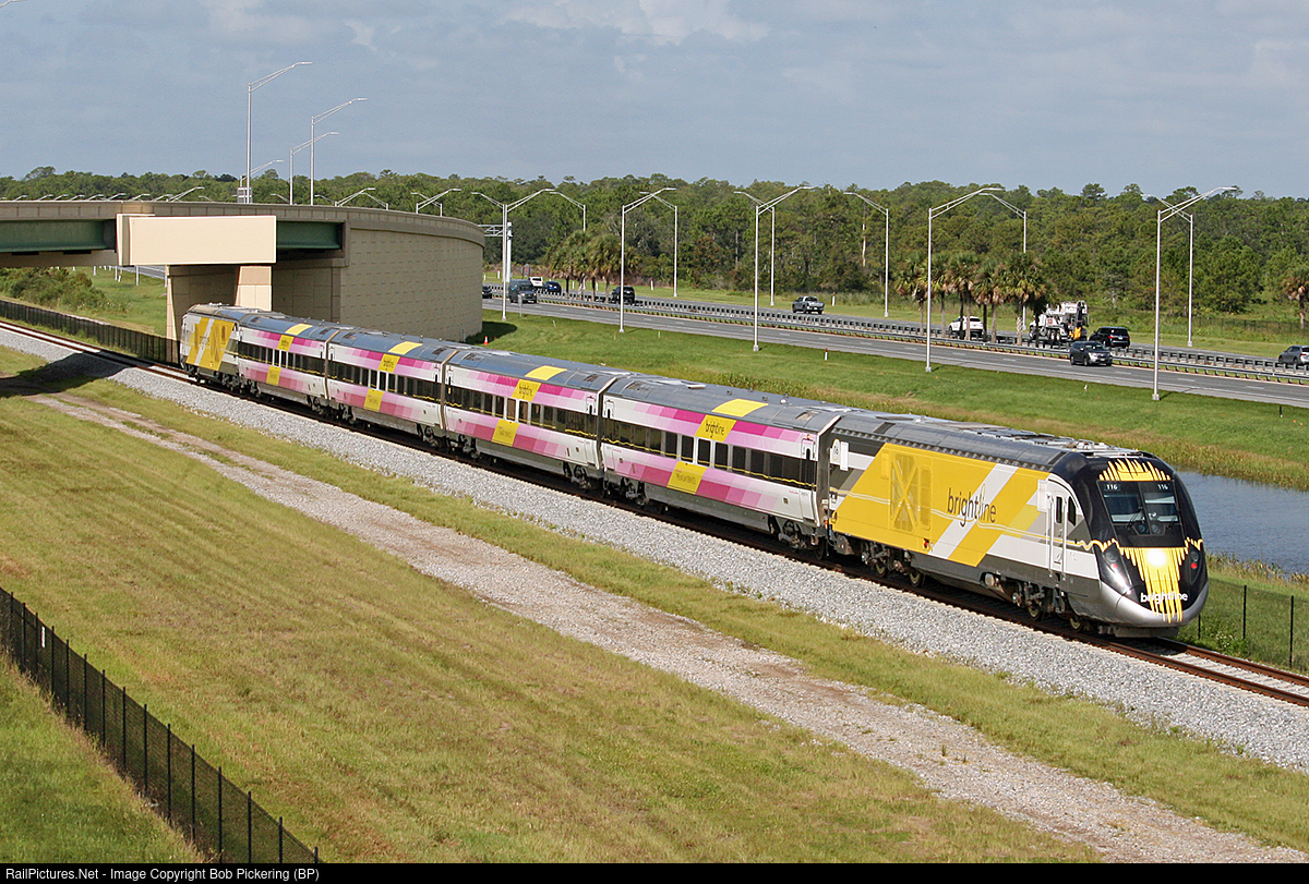 | Inaugural Train from Miami blasts toward Orlando on new track built next to the Beachline, connecting Orlando to the FEC. This is 125 mph territory! |