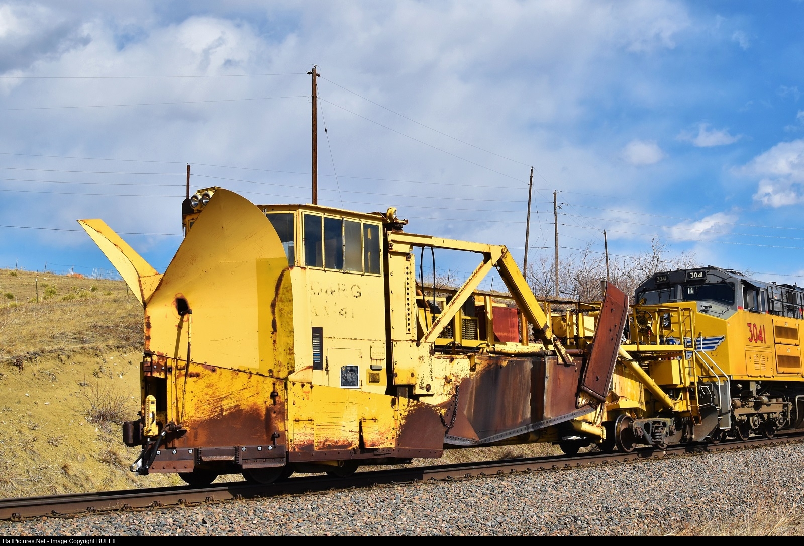 | The Union Pacific pulls a Denver & Rio Grande Western Railroad Jordan Spreader towards Denver and will eventually run it all the way to Cheyenne, Wyoming to help with heavy snows.