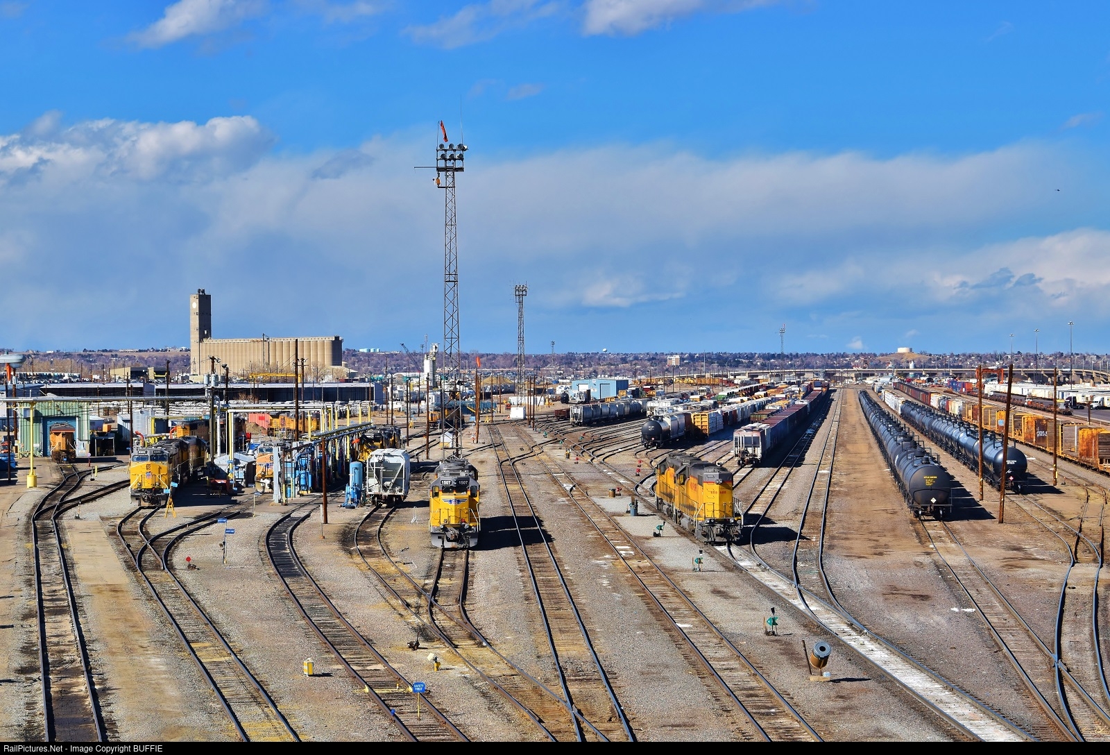 | A wide-angle view of the Union Pacific's North Yard in Denver, Colorado shows the fuel and sand service islands on the left, the ready tracks in the middle (with a former Southern Pacific GP40M - UP 1507 - holding station) and the yard ladders on the right.
