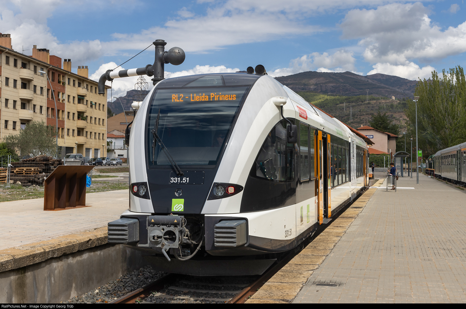 | Broad gauge articulated lowfloor diesel regional train, called "Panorama train" 331 # 51 of the FGC (Ferrocarrils Gerneralitat Catalunya) ready for departure in La Pobla de Segur for Lleida Pirineus. Built by StadlerRail in 2015 with two Deutz diesel prime movers of 960 kW total and a maximum velocity of 120 km/h. Two of this train were built in 2015, a third in 2021. The operation on the former Renfe line Lleida-La Pobla de Segur was taken over by the FGC. |