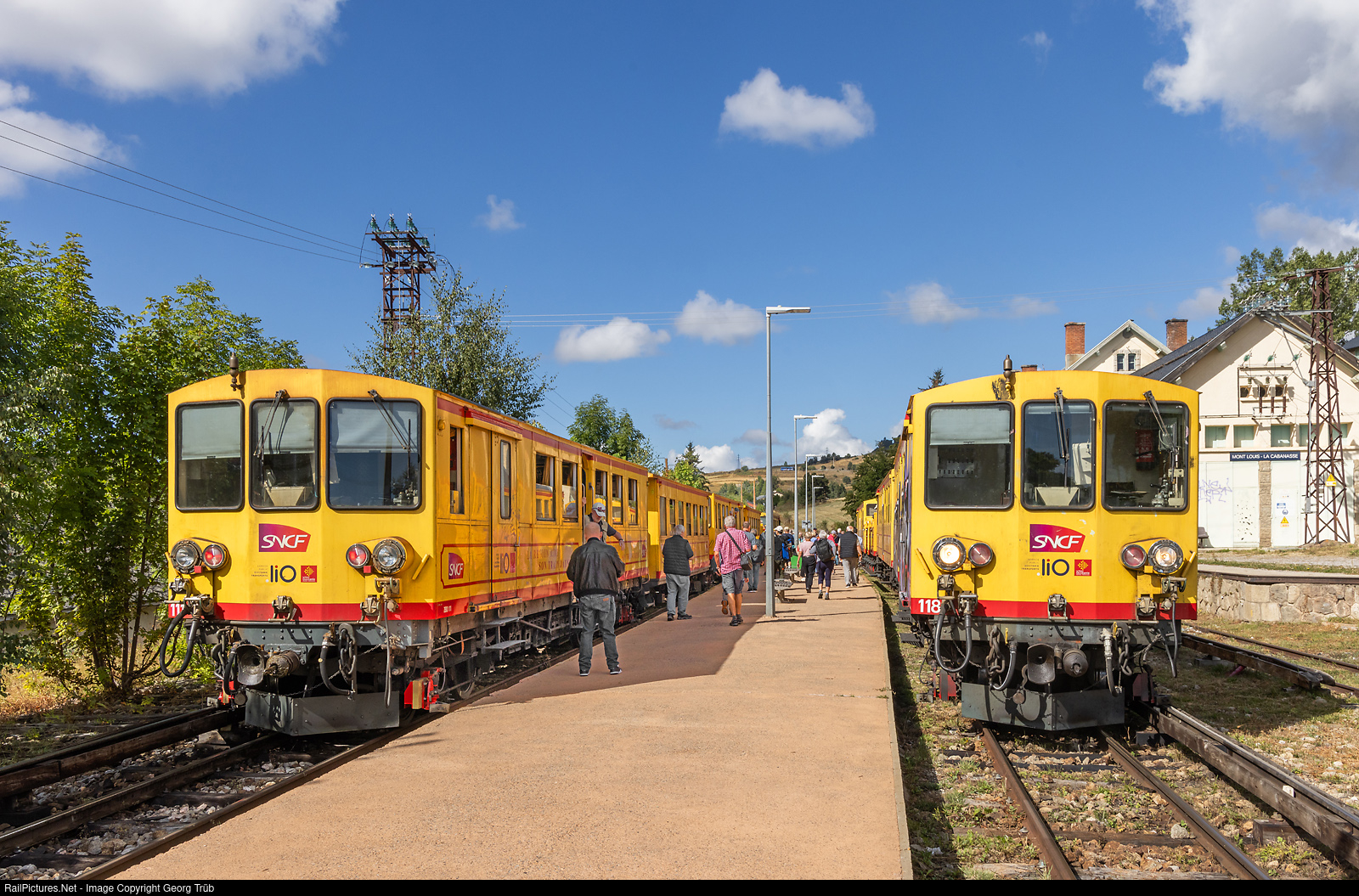 With its 63 km, the Yellow Train (Train Jaune/Le Canari) route that goes from Villefranche-de-Conflent – Vernet-les-Bains/ to Latour-de-carol – Enveitg, also known as the Train Line of Cerdanya, serves 21 train stations, 8 of which are obligatory stops (Villefranche-de Conflent, Olette, Fontpédrouse Saint-Thomas-les-Bains, Mont-Louis, Font-Romeu, Saillagouse, Bourg Madame and Latour de Carol / Enveitg), and the others are optional “on request” stops (also called Railway Stops). It is a fun and memorable way to discover the territory of the Natural Regional Park of the Catalan Pyrenees in open or closed wagons, depending on the season. The train is running on 1 meter gauge and operated with 850 V DC from thrid rail, maximum grade of 6.0 %. All the motive power is that of the line's origin, with the exception of the two Z 150 railcars delivered in 2004. It is fitted with Leduc-Lambert automatic couplers. The Z 100s were built by SACM in Belfort and by the Carde workshops in Bordeaux. They were renovated between 1963 and 1968 at the Marseille Prado workshops, then between 1984 and 1988 at the Béziers workshops, when they were painted canary yellow. Their maximum speed is 60 km/h. Here railcars Z # 111 and # 118 with there trains are crossing in Mont-Lois-La Cabanasse station on 1512 meter a.s.l.