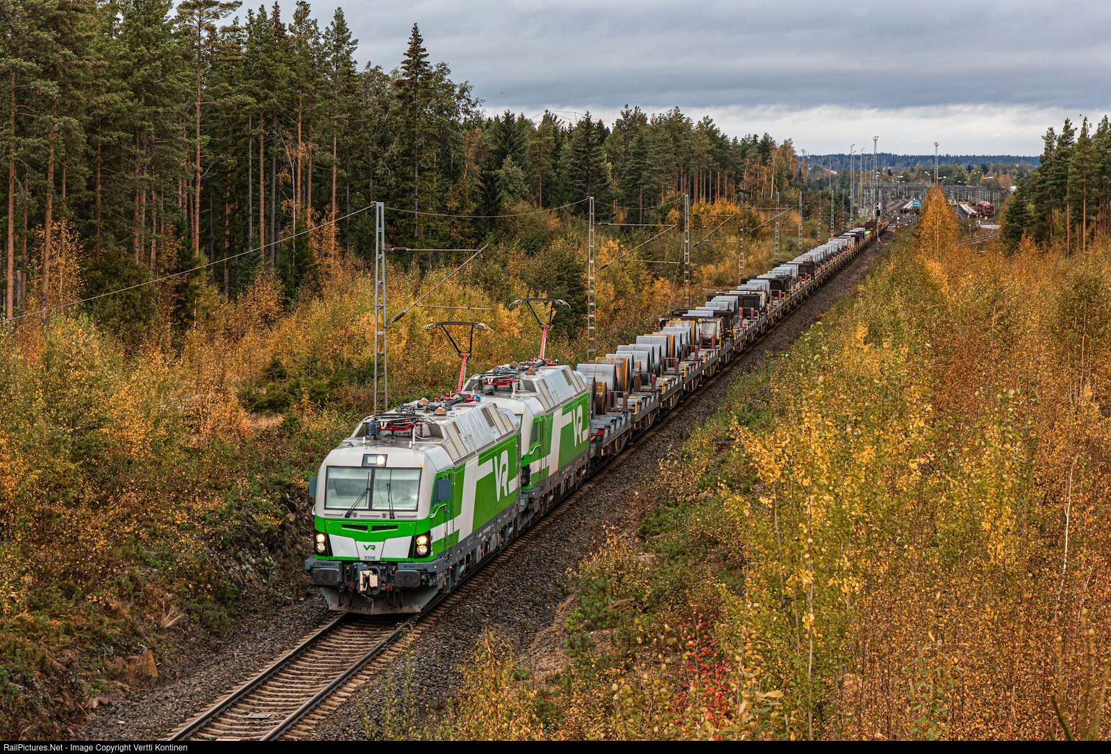 | A pair of VR Vectrons 3306 and 3347 working a steel coil train back to speed after a crew change at Seinäjoki. The train is T 5008 from Raahe steel mill to SSAB steel works at Hämeenlinna and is one of the heaviest trains in Finland earning the nickname "Mega train" |