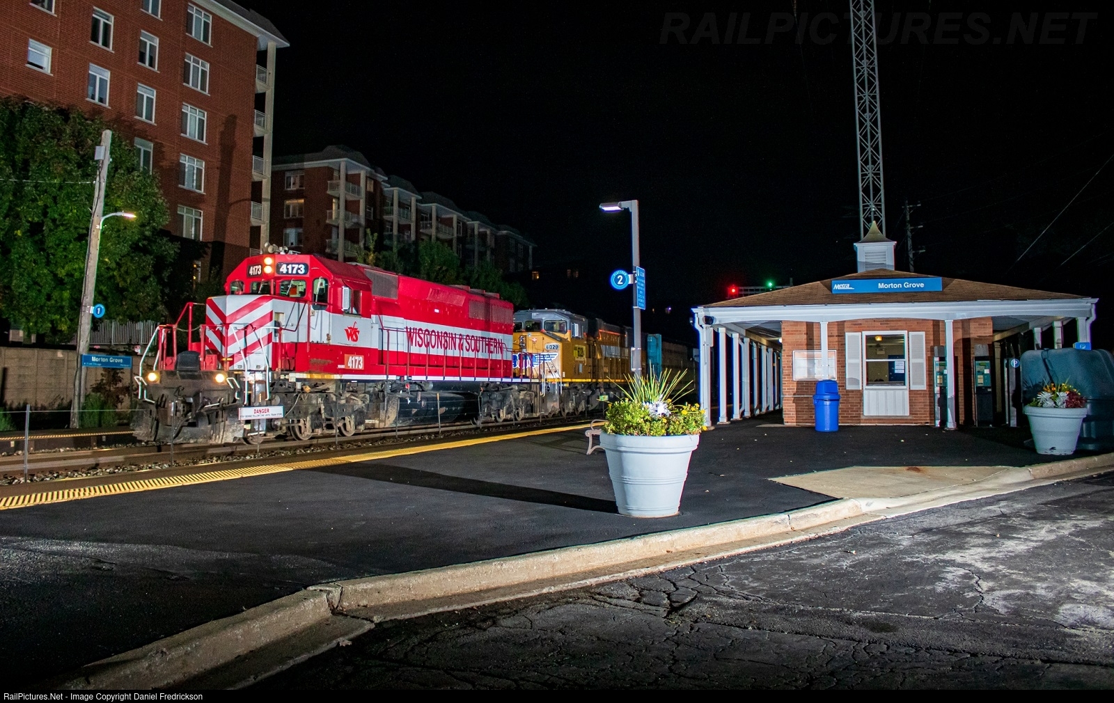 Wisconsin and Southern's nightly T001 train from the BRC rushes past the old Morton Grove, IL Metra depot, which (per online sources) is slated for demolition after construction of a new depot. WAMX 4173, the only PTC-equipped SD40-2 on the WSOR roster, leads the way.