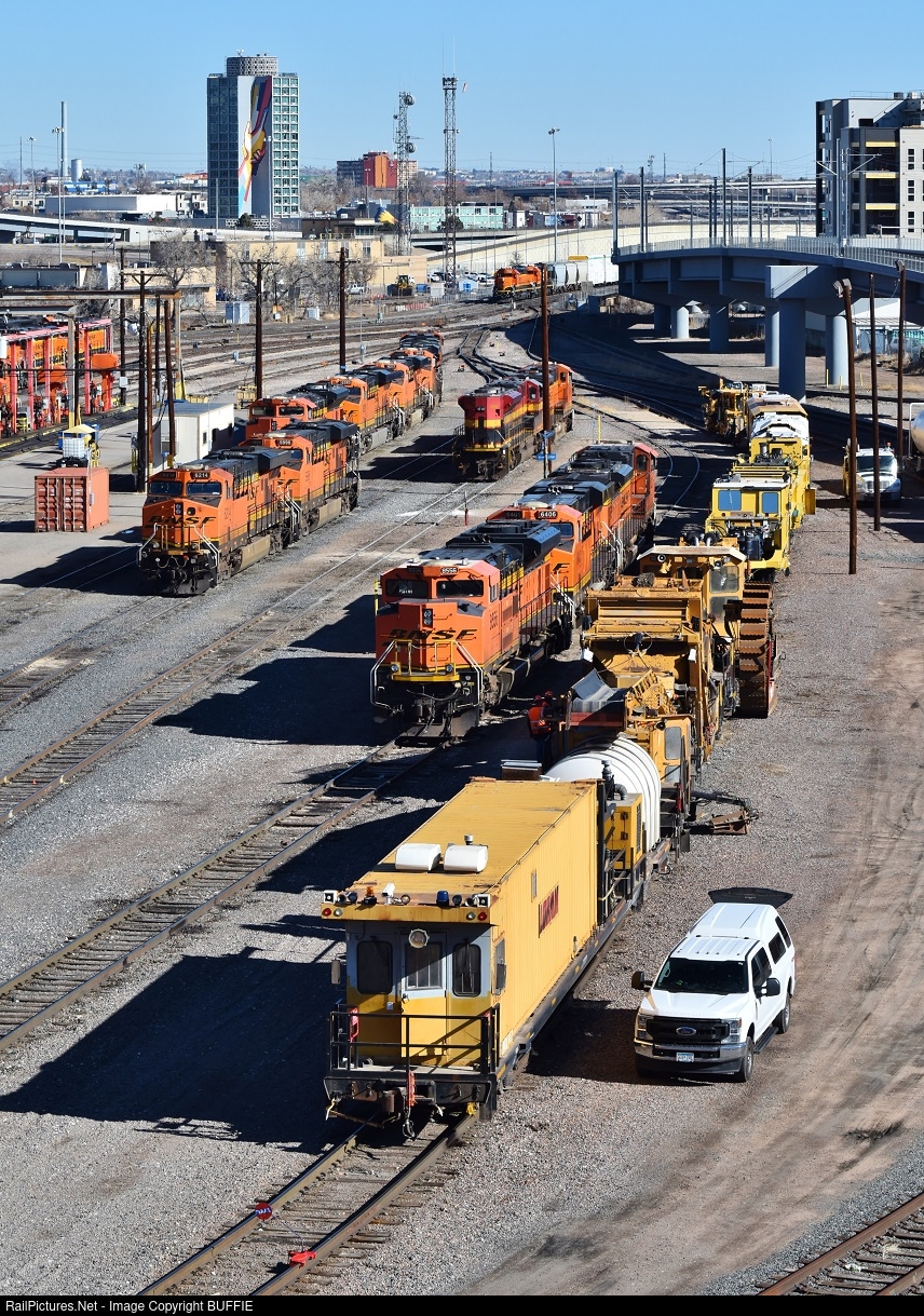 A Loram maintenance of way train gets ready to leave the BNSF engine servicing facility in Denver, Colorado.
