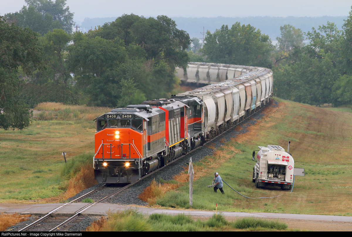 Dakota, Missouri Valley & Western’s wayfreight pauses for fuel at Wilton, North Dakota, on August 27, 2018. Leading the train is one of DMV&W’s former Canadian National EMD SD50F cowl No. 5408, and it soon will be getting a drink from the Cenex truck.
