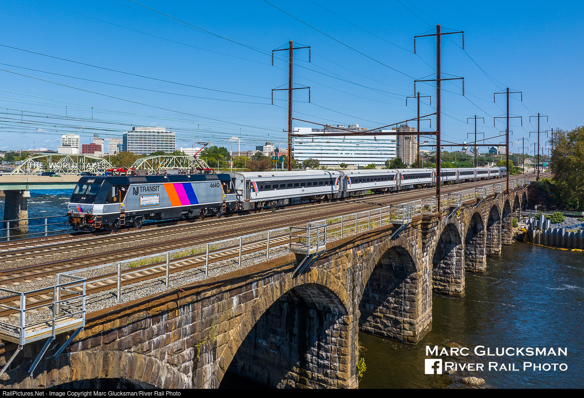The World Takes New Jersey Transit. NJ Transit train 3835 was heading to the Morrisville, Pennsylvania yard after completing its run to Trenton, New Jersey from New York Penn Station when it passed by the famous sign on the Route 1 Bridge on September 20, 2023. NJTR ALP-46A 4640 is NJT's newest heritage unit, its paint a tribute to the E-60/ALP-44s that once covered this ground. The former Pennsylvania Railroad Morrisville–Trenton Railroad Bridge stone arch bridge opened in 1903 and continues to carry over a hundred trains a day.