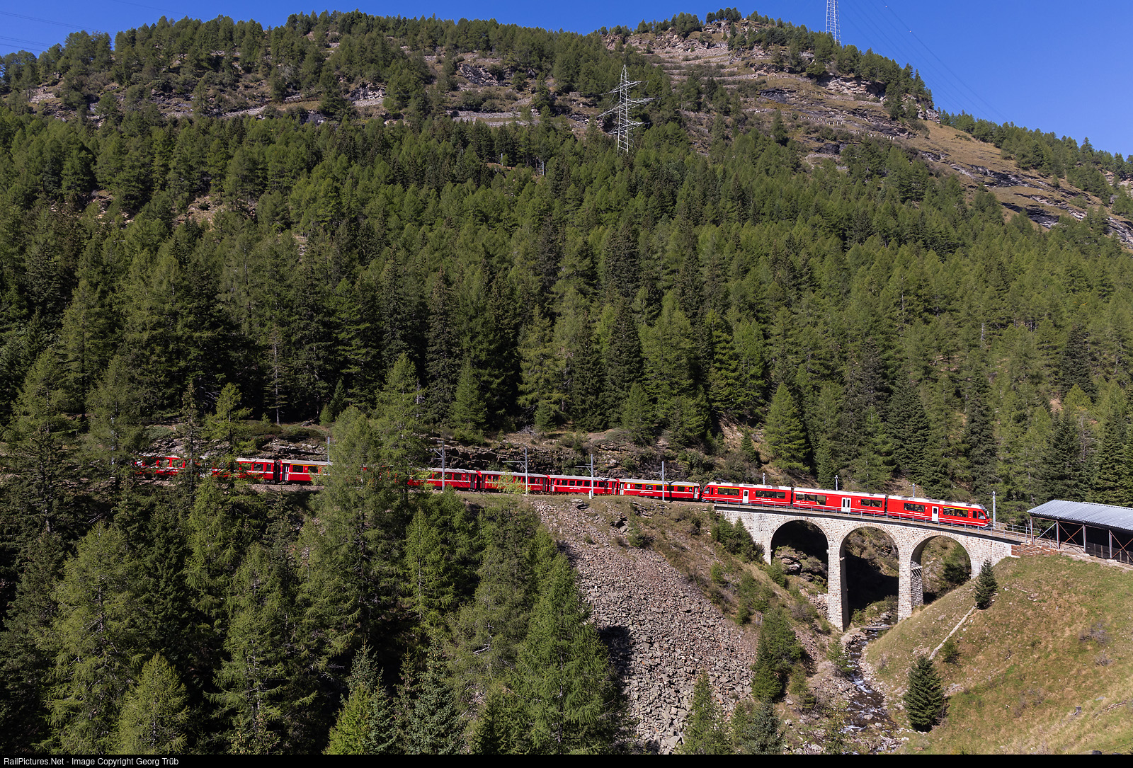 | "Allegra" ABe 8/12 # 3507 of the Rhaetian Railway pulls the regional train 1625 from St.Moritz over the Bernina line to Tirano, over the 21 meter high and 50 meter long Val da Pila viaduct between Stablini and Cavaglia. The longest trains on this line with 7.0 % grade and radius of about 50 meter have one more car! |