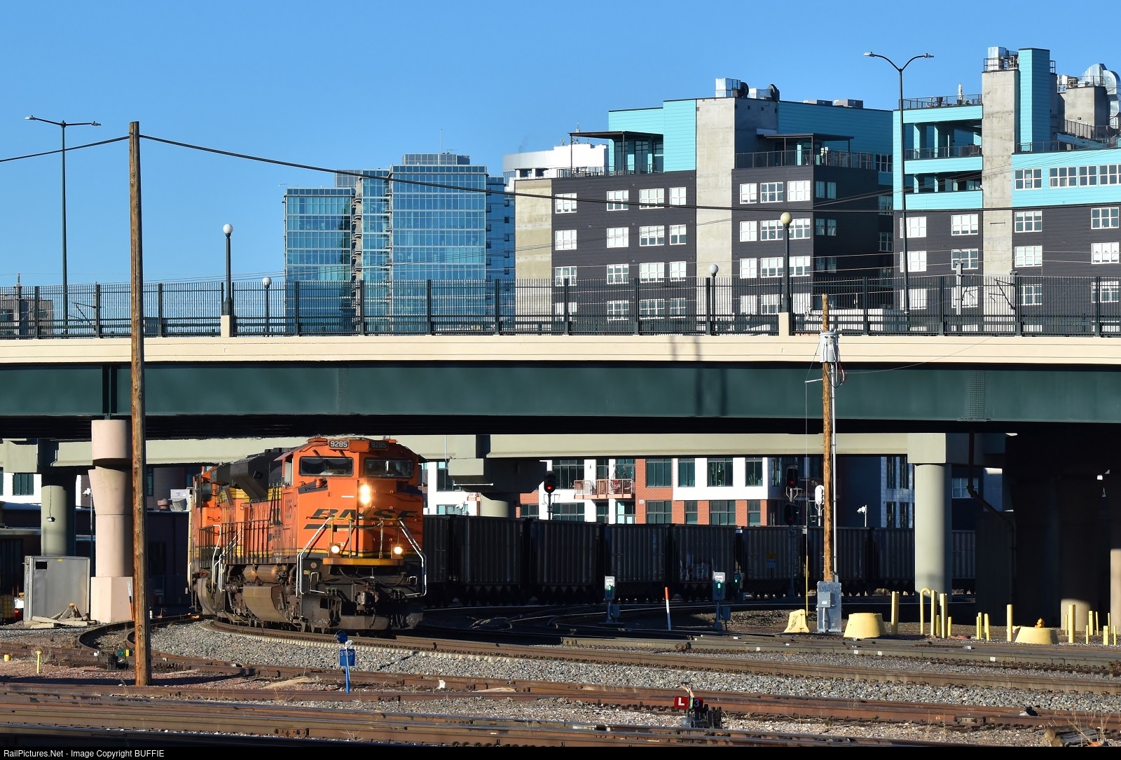 BNSF 9285 (SD70ACe) leads an empty coal train under the Park Avenue Viaduct in Denver as it heads to the Denver Yard for a change in crew.