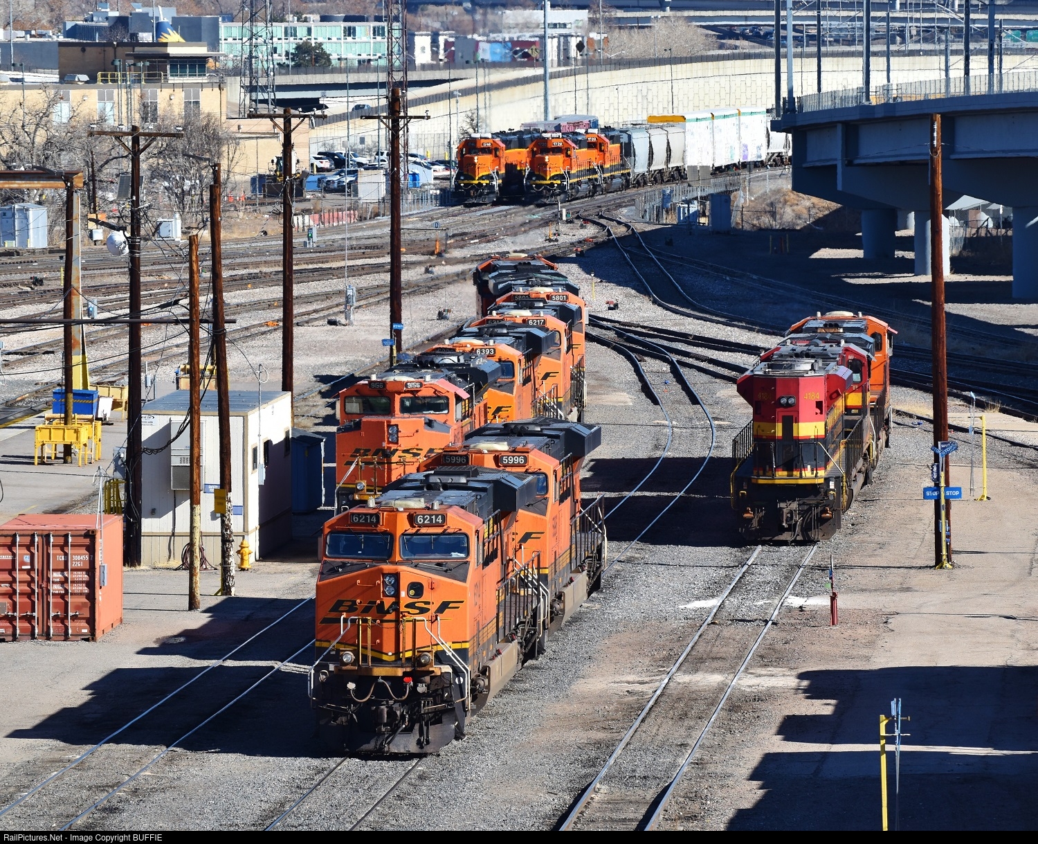 | BNSF 6214 (ES44AC) waits in the BNSF servicing yard in Denver, Colorado as two pairs of light power pull out strings of cars for sorting.