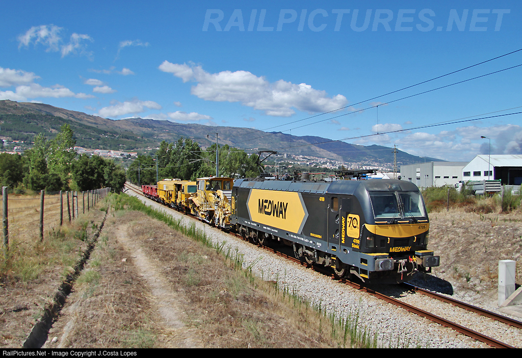 | A Medway train with working machines on the track, from Guarda to Entroncamento pulled by the locomotive Siemens 4709.