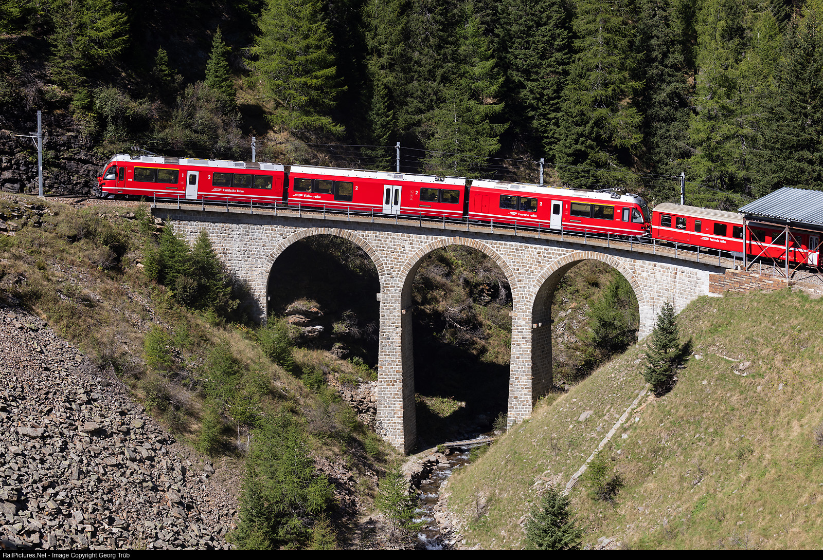 | "Allegra" ABe 8/12 # 3502 of the Rhaetian Railway pulls the regional train 4648 from Tirano to St.Moritz over the Val da Pila viaduct, on a grade of 7.0 % and with a radius of 50 meter, between Cavaglia and Stablini. |