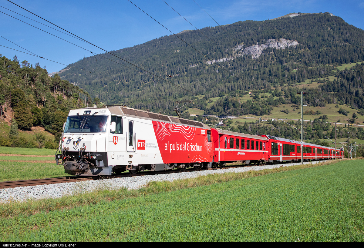 | The 1994 built locomotive Ge 4/4 III 645, painted in the publicity paint scheme for RTR Radio-Television Swiss Rumantscha which offers programming to Romansh-speakers in Switzerland and around the world, is pulling the interregio train 1129 from Chur to St. Moritz. |