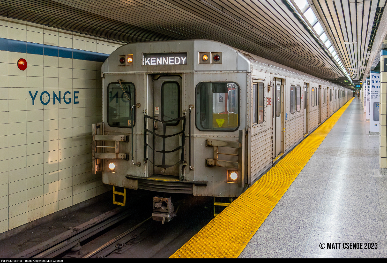 Toronto Transit Commission (TTC) T1 car no. 5143 (Bombardier, 1995-2001) is the lead unit on a Kennedy-bound Line 2 train, seen stopped at Bloor-Yonge Station. |