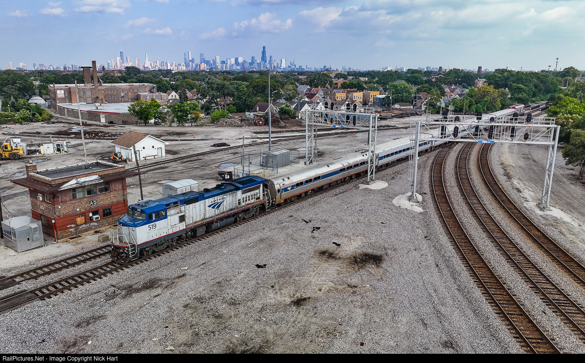 | Tower A5. While no longer manned, Tower A5 is still used for maintenance of way by Metra. On this particular day, the venerable tower witnesses the passage of Amtrak Hiawatha train #338, heading into Chicago with Dash 8 519 shoving hard at the rear. This location is where the Metra Milwaukee District North and West Lines split. |