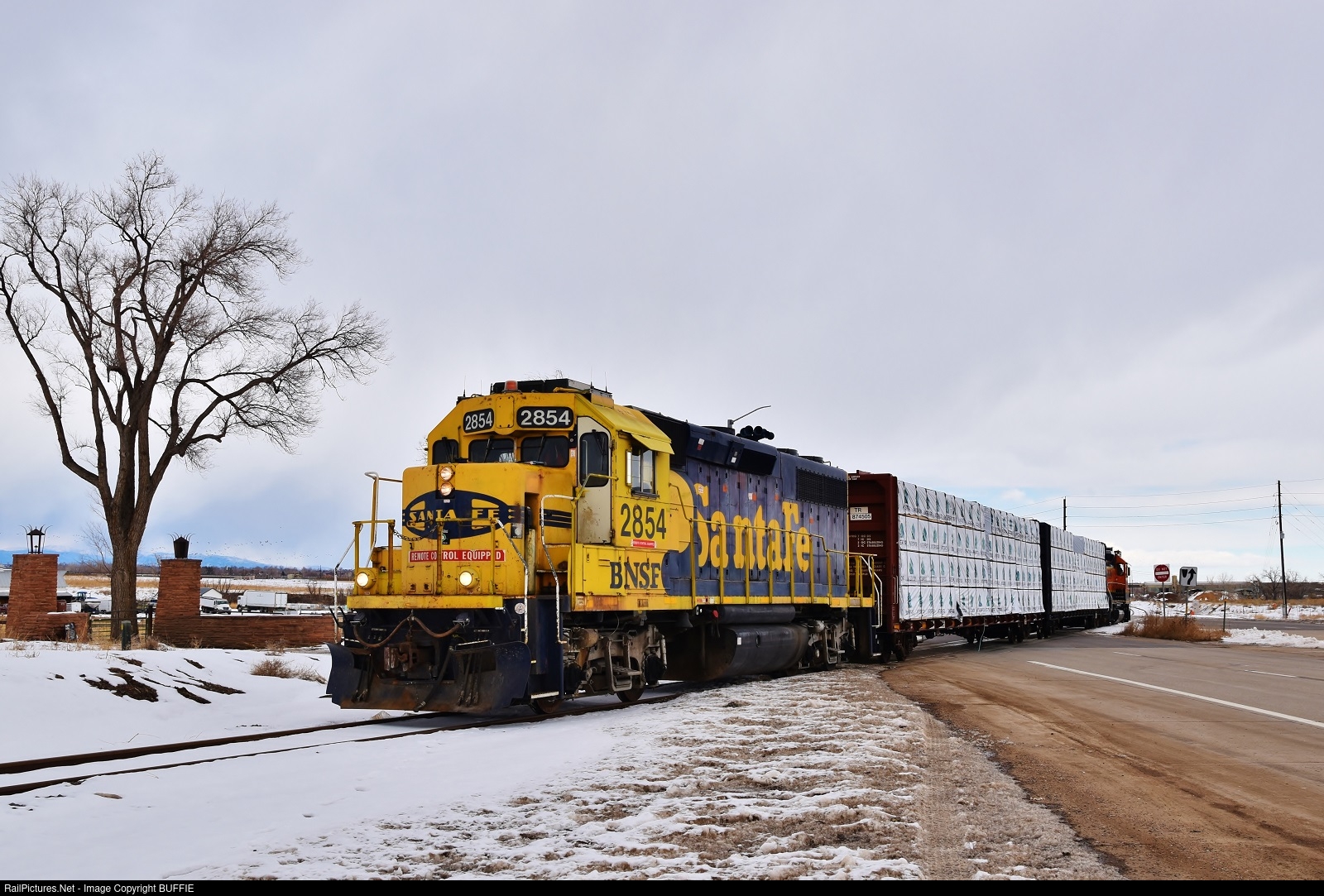 Light snow is falling as BNSF 2854 (GP39-2) crosses the road in a pull me / push you configuration with a motor on the other end of the short train.