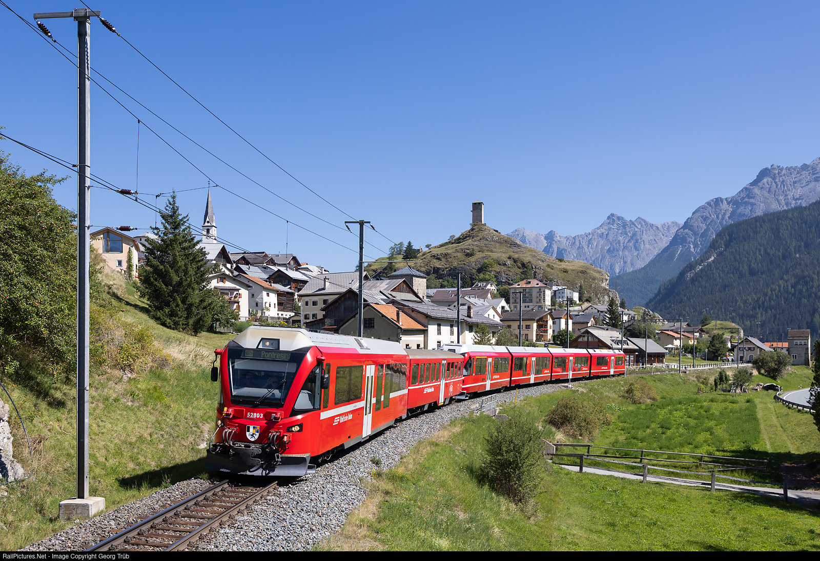 | Regional train 1941 of the Rhaetian Railway from Scuol-Tarasp via Zernez-Samedan to Pontresina, is leaving Ardez. Leading is partly lowfloor cab car Bt # 52803, followed by a WS bicycle car and shoving railcar "STZ" ABe 4/16 # 3105. |
