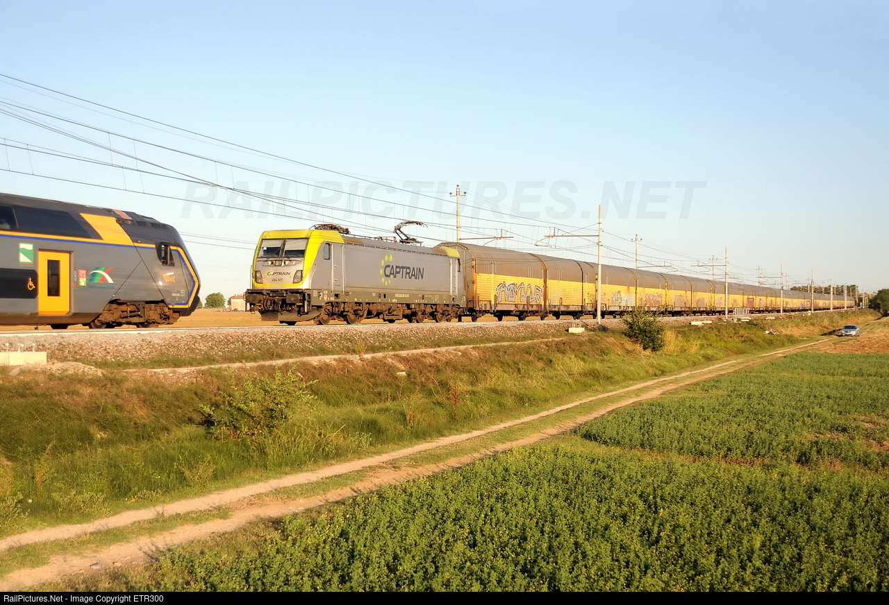 E.494.507 of Captrain Italia on the top of an empty car carrier service Ravenna-Brennero crosses a regional service operated with a double-deck EMU Class ETR.521.