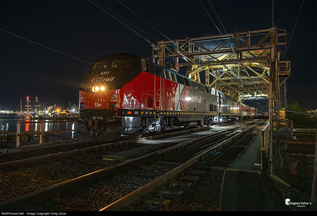 On the night of September 21st, 2023, CDOT Extra 6707, led by back to back CTrail (CTDX) GE P40BH's 6707 & 6709, tows 10 MBB BTC/CTC-3 coaches over the Shaws Cove Bridge in New London, Connecticut on the Shore Line section of Amtrak's Northeast Corridor. The railcars were on their way back to the MBTA in Boston, Massachusetts after serving a 5-year lease on the Hartford Line in the state of Connecticut.