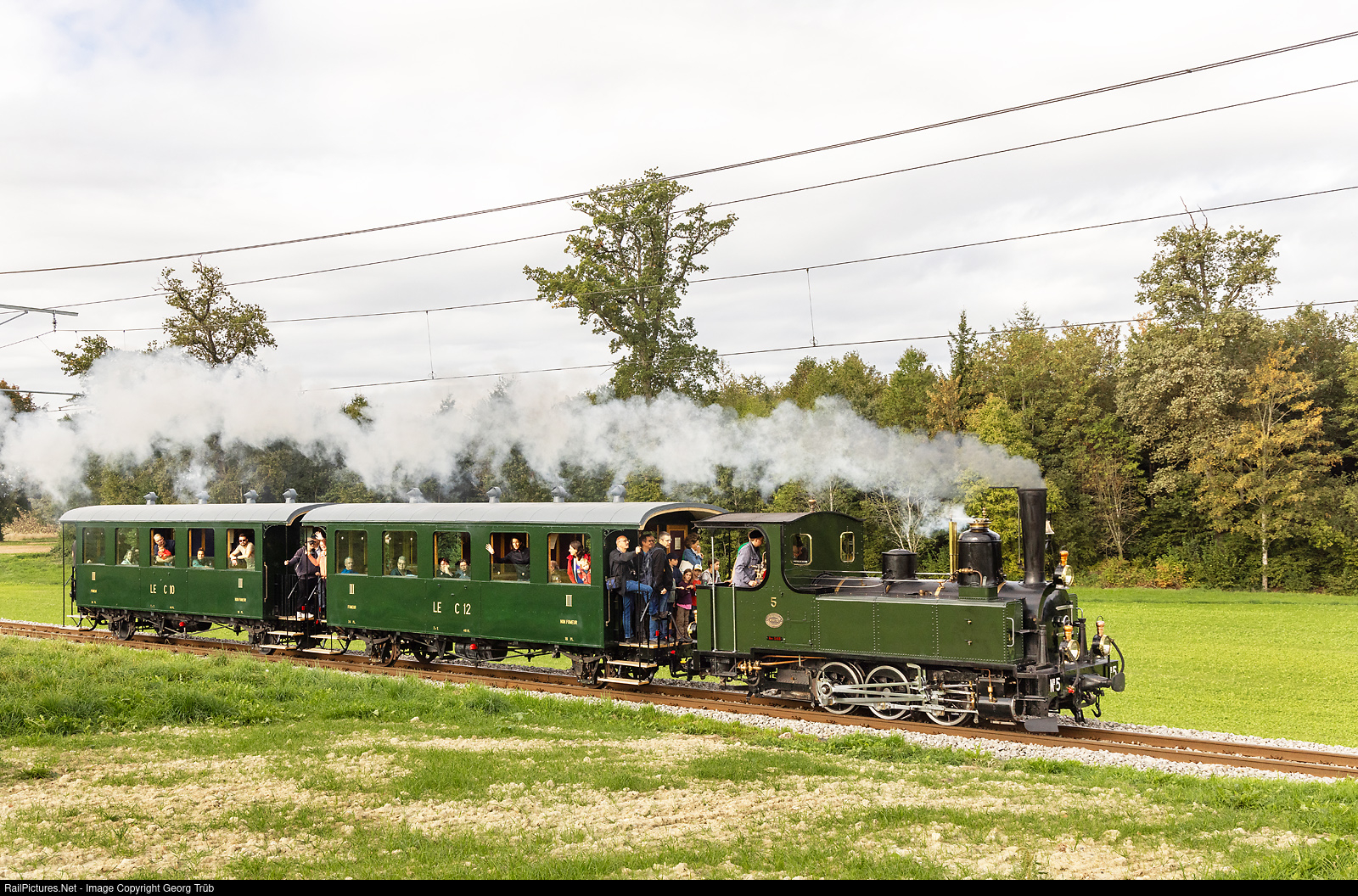 | For the 150th anniversary (1873 to 2023), the meter gauge Lausanne-Echallens-Bercher Railway invited as guest locomotive the G 3/3 # 5 of the Blonay Chamby Museum Railway. Together with the two own passenger cars C # 12 (built 1914) and C # 10 (built 1908) a nice train could be formed, which ran three times between Echallens and Bercher on both days of the weekend September 30th/October 1st. The first train can be seen in full speed between Sugnens and Fey. The steamlocomotive was built in 1890 by the Alsatian Mechanical Engineering Company (EMBG) in Grafenstaden for the Lausanne-Echallens-Bercher Railway (LEB) and is owned by the Blonay-Chamby Railroad Museum since 1973, operational since 1985. |