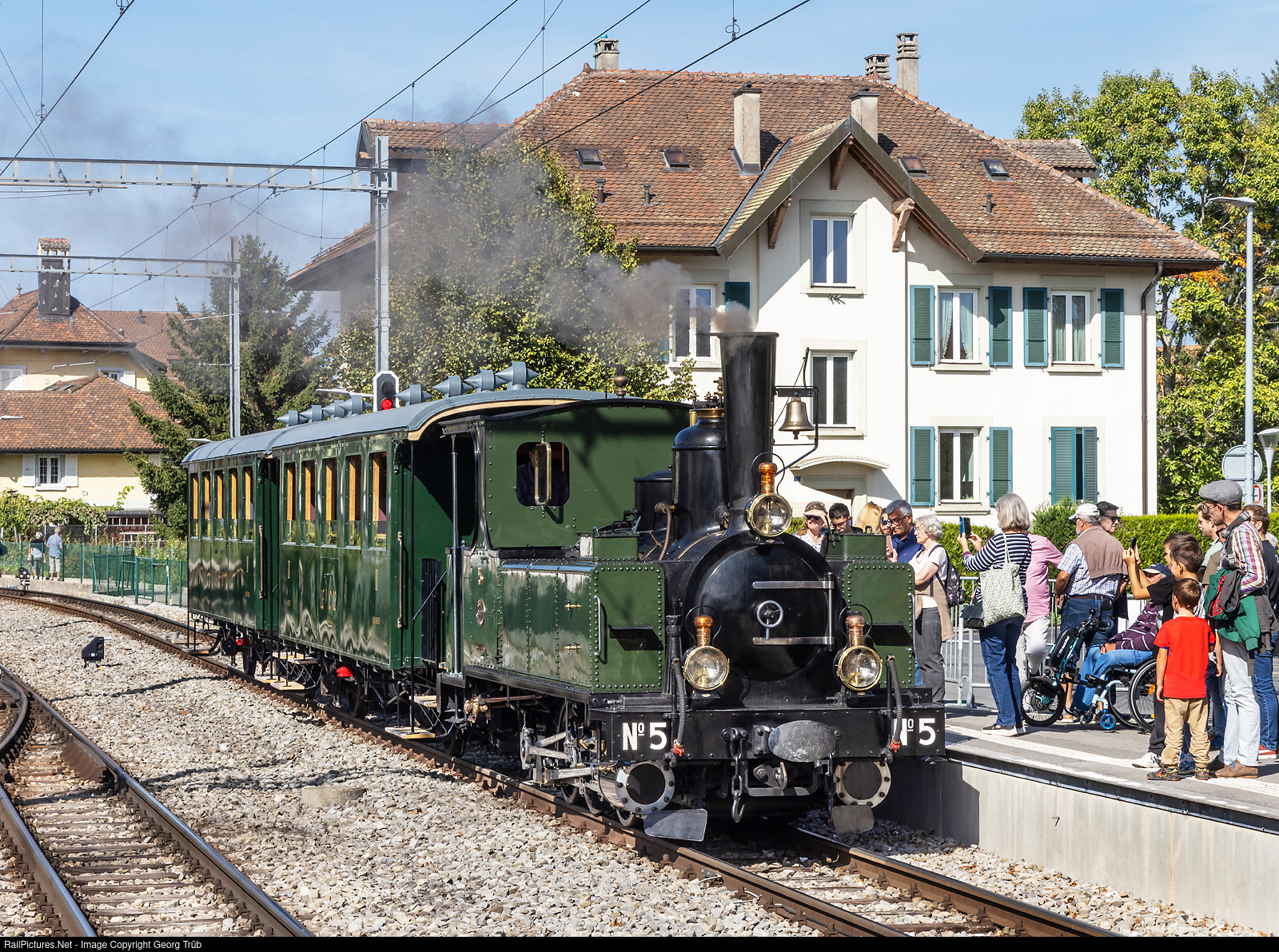 | For the 150th anniversary (1873 to 2023), the meter gauge Lausanne-Echallens-Bercher Railway invited as guest locomotive the G 3/3 # 5 of the Blonay Chamby Museum Railway. Together with the two own passenger cars C # 12 and C # 10 a nice train could be formed, which ran three times between Echallens and Bercher on both days of the weekend September 30th/October 1st. The steamlocomotive was built in 1890 by the Alsatian Mechanical Engineering Company (EMBG) in Grafenstaden for the Lausanne-Echallens-Bercher Railway (LEB) and is owned by the Blonay-Chamby Railroad Museum since 1973, operational since 1985. |