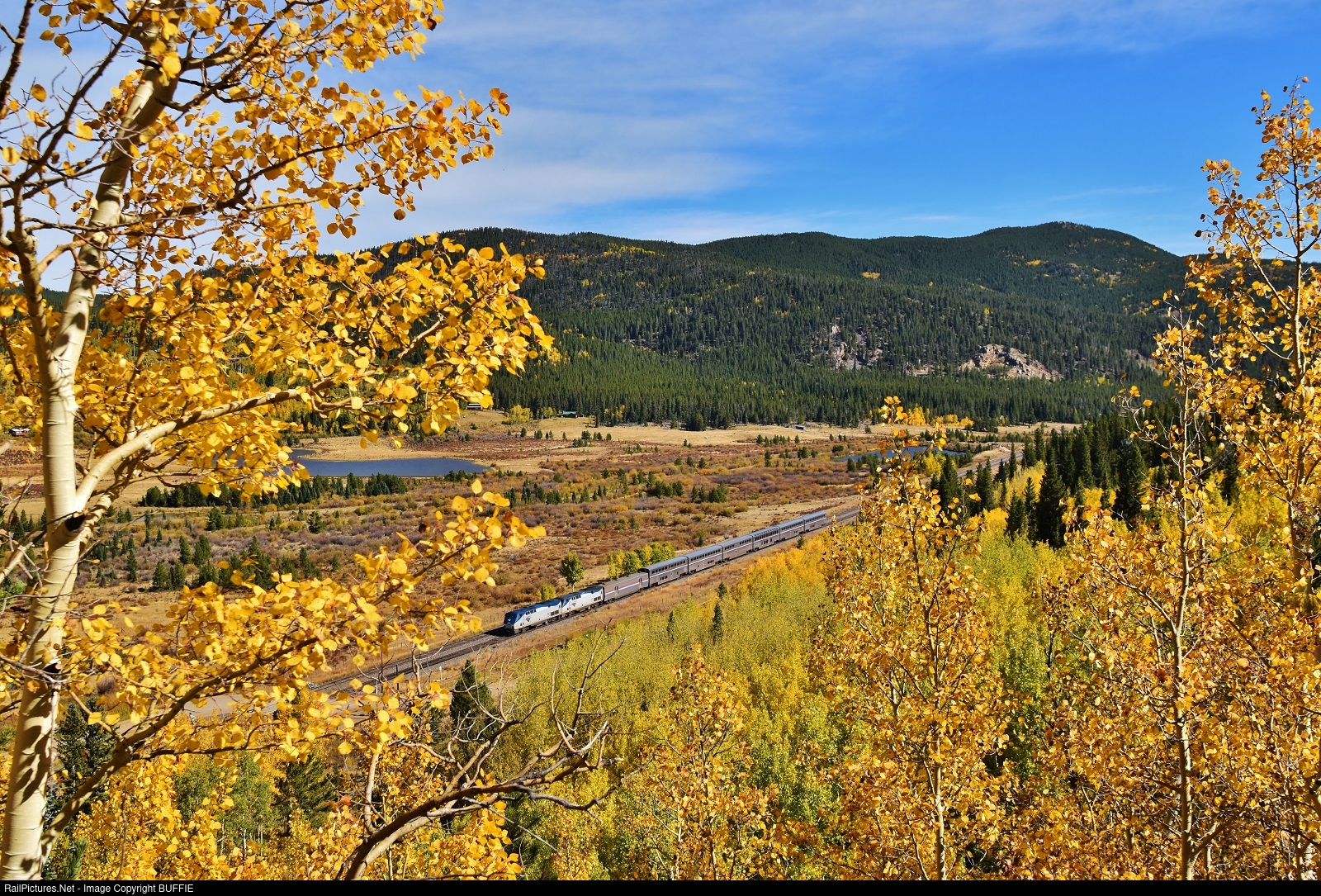 | The California Zephyr #5 runs through the valley at Tolland, Colorado which is bathed in gold from the turning aspen trees. |