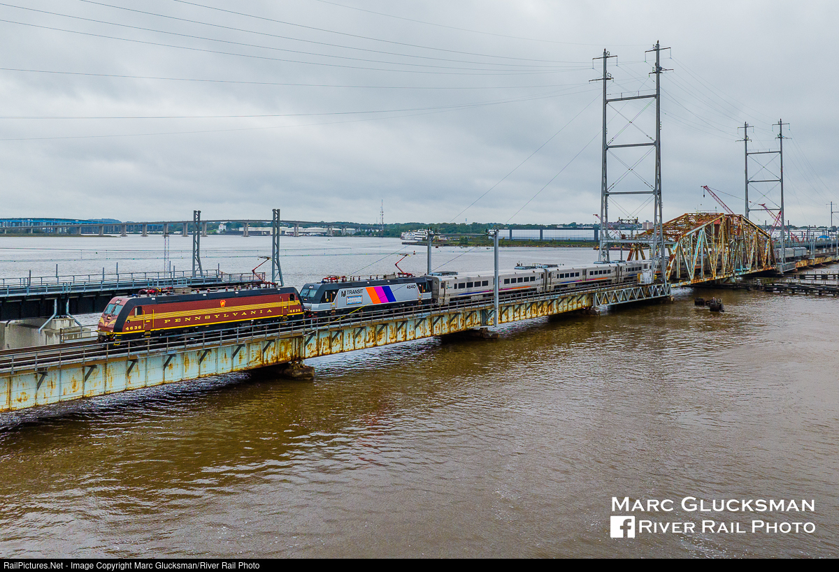 Excursion Over River Draw. The NJ Transit and United Railroad Historical Society of NJ operated an excursion train on Saturday, September 30, 2023 from New York Penn Station to Bayhead, New Jersey on the North Jersey Coast Line, with the return leg terminating at the Hoboken Terminal. Bombardier built ALP46-As NJTR 4640 (40th Anniversary, "Disco") and NJTR 4636 (Pennsylvania Railroad Heritage) led to South Amboy, where the first engine change since 1988 took place, placing NJTR F40s 4119 and 4120 in the lead for the rest of the trip. In addition to 5 Comet V cars, 4 private cars (Pennsylvania Railroad "120" and the Warrior Ridge/1157, and New York Central 43 and Hickory Creek) were used to make the unique consist. With the electric motors in the lead, the train crosses River Draw over the Raritan River from Perth Amboy to South Amboy, New Jersey. Construction of its replacement can be seen in the background. The Pennsylvania Railroad tribute unit represents the GG-1 that once roamed these lands, the "disco" stripe is the stand in for E-60s and ALP-44s.