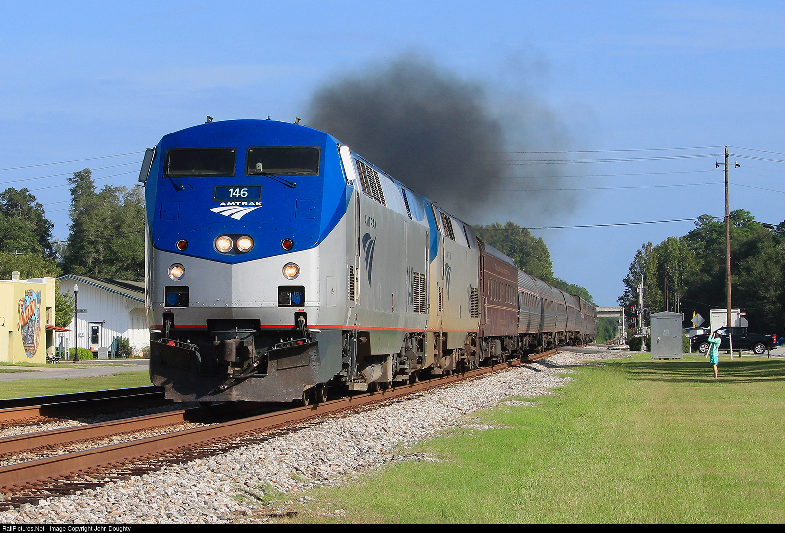 | AMTK 146 and AMTK 196 accelerates as it leads the Federal Railroad Administration car DOTX 221 and the Silver Meteor south through Folkston, Georgia. |