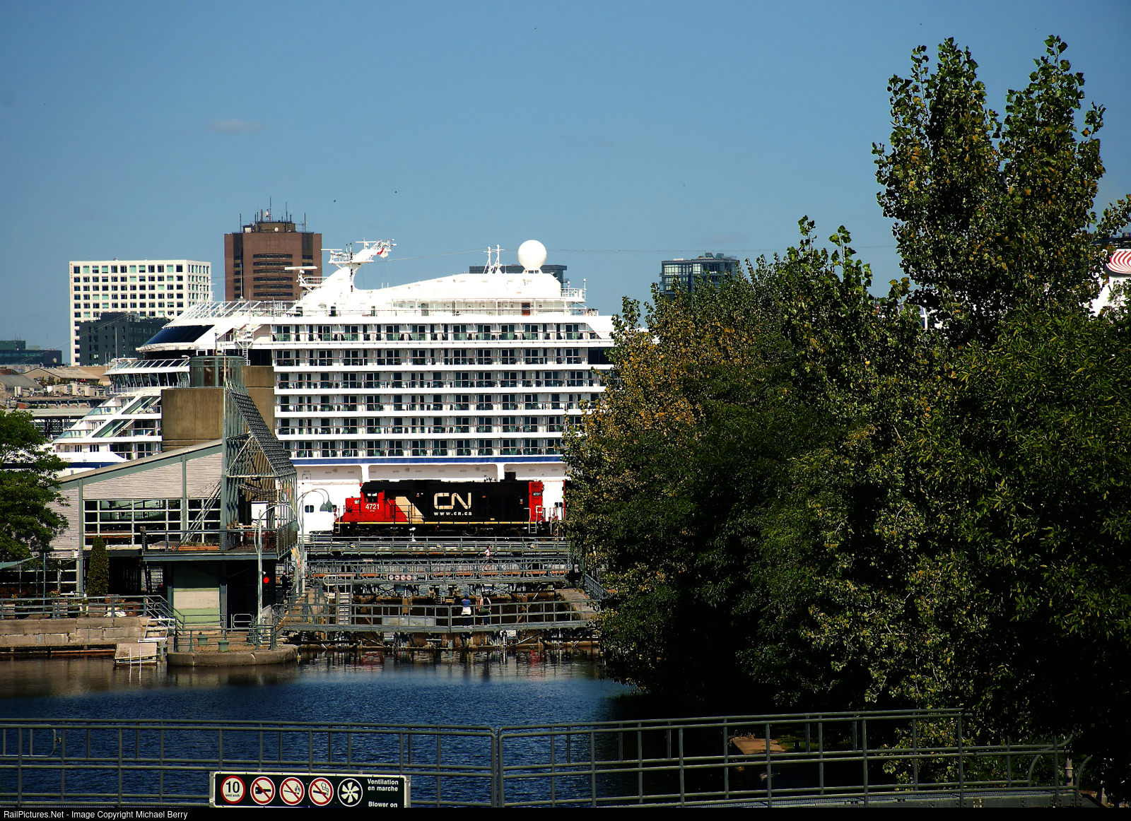 CN 4721 is dwarfed by a cruise ship as it advances over the Lachine Canal for headroom as it switches grain cars.