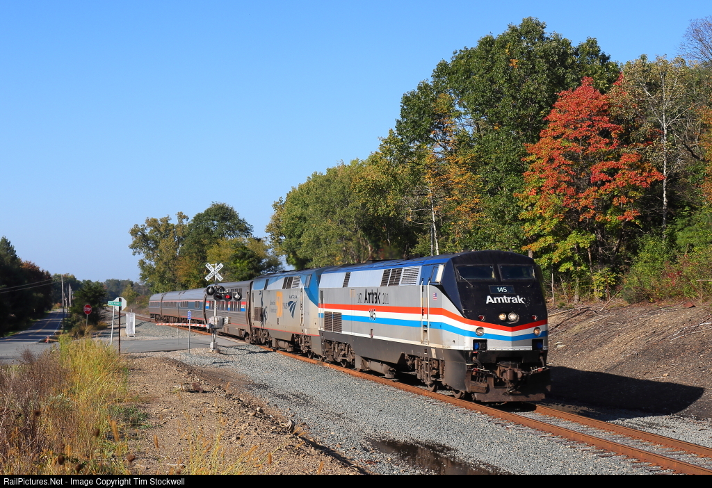 With 40th Anniversary-painted P42DC #145 leading 50th Anniversary-painted P42DC #46 for power, Amtrak Train 448 -- the Albany-Rensselaer to Boston section of the Lake Shore Limited -- heads east on Amtrak's Post Road Branch in Schodack, NY, crossing Duck Pond Road. Just around the corner, the train will get on CSX's Berkshire Subdivision.