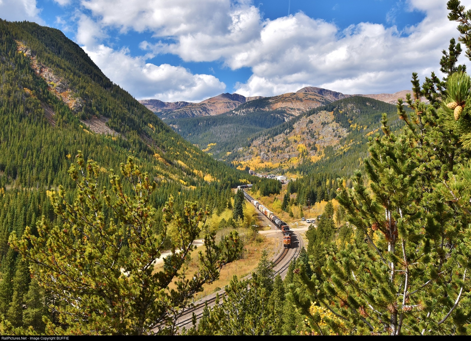 BNSF 7652 (ES44DC) leads a freight down from the Moffat Tunnel East Portal and through the valley lined with golden aspen.