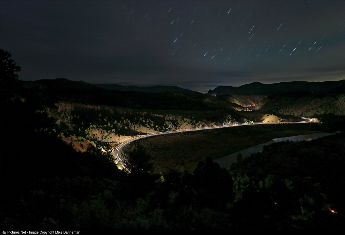 A partly cloudy, moonless night reveals an eastbound Union Pacific oil train following the Colorado River into Little Gore Canyon on September 18, 2023. The lead locomotive headlights illuminate the mountainsides, later traced by the dimmed headlights of a DPU unit. Little Gore Canyon is lit up red in the distance, and just to the left and above it is Sugar Loaf Mountain that rises above Gore Canyon and glowing car headlights curving around Gore Valley overlook at Inspiration Point. In the foreground on the right are two campfires from rafters overnighting along the river.