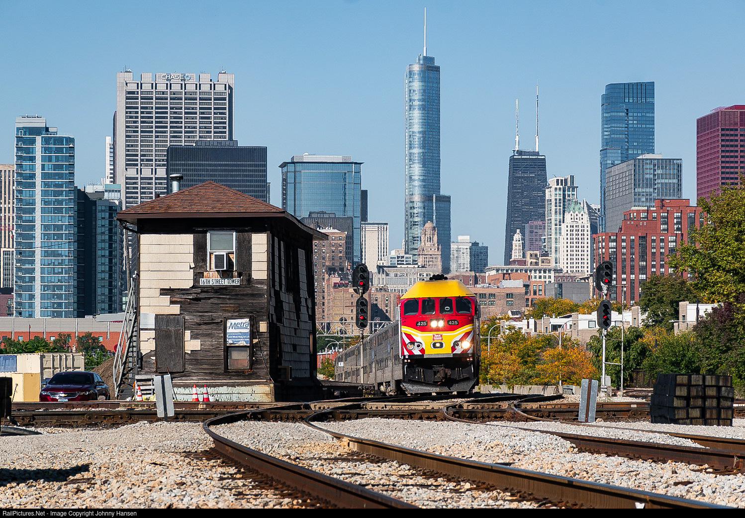 | It’s a gorgeous sunny Sunday afternoon on the first day of October in Downtown Chicago, as Metra 115 outbound to Joliet gets underway as it departs LaSalle Street Station and is seen here crawling past the historic 16th Street Interlocking tower with Metra’s Rock Island inspired heritage locomotive leading. |