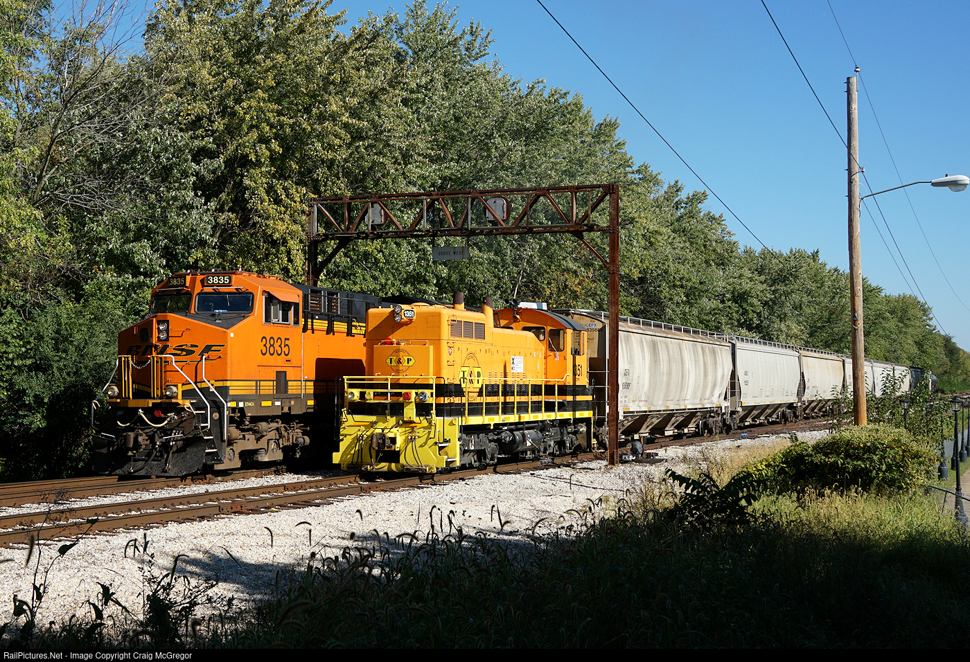| A BNSF empty grain train was heading through the switch when it derailed it's lead axle thereby fouling the crossover plant. Tazewell & Peoria's "Pekin Job" passes the disabled ET44C4 on it's way to it's namesake city. |