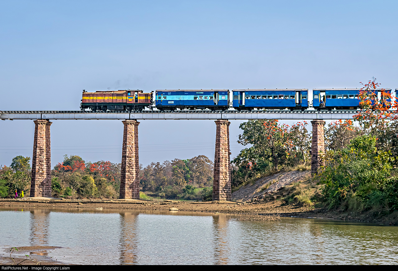 Erstwhile 762mm narrow gauge route is now closed for making into broad gauge section. ZDM-3 # 194, leads Nagbhir to Itwari NG passenger over old, stone made Marhu river bridge.
